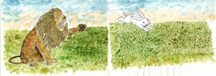ウサギは必死で逃げました。そう、弱虫ライオンのためです。
